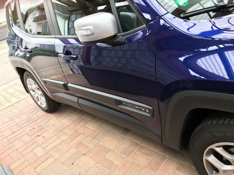 Für den Renegade-Schriftzug sind die vorderen Leisten ausgeschnitten. In den hinteren Leisten findet sich das Jeep-Grill Symbol wieder. Die Leisten sind relativ dick und verhindern, vor allem in engen Tiefgaragen sehr gut, dass man sich aus Versehen einen Macken holt. (Hilft auch gut gegen Einkaufswagen und Türen auf dem Supermarktparkplatz)