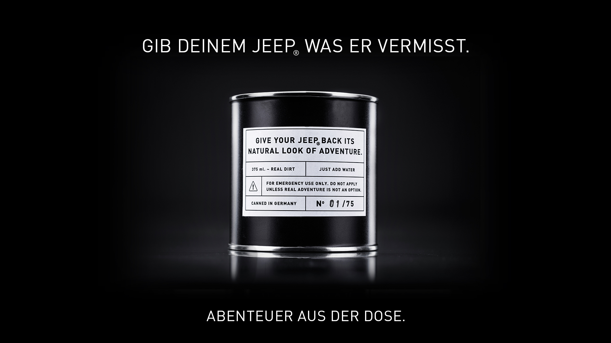 Vermisst Dein Jeep® auch das Abenteuer? Dann ist die Jeep® Mud Mask seine Rettung. Ein Limited Edition Notfallprodukt, das speziell zur Anwendung bei unter Abenteuerentzug leidenden Jeeps® entwickelt wurde. Hergestellt aus 100% echter Erde, enthält sie alles, wonach sich die Haut wahrer Abenteurer sehnt.