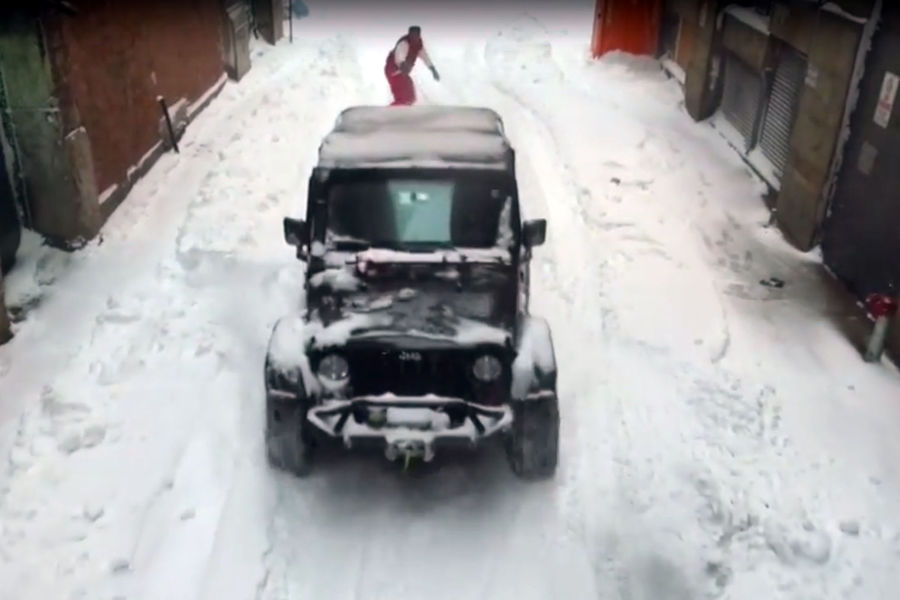 Und für die ganz harten Männer ... Jeep-Snowboarding !