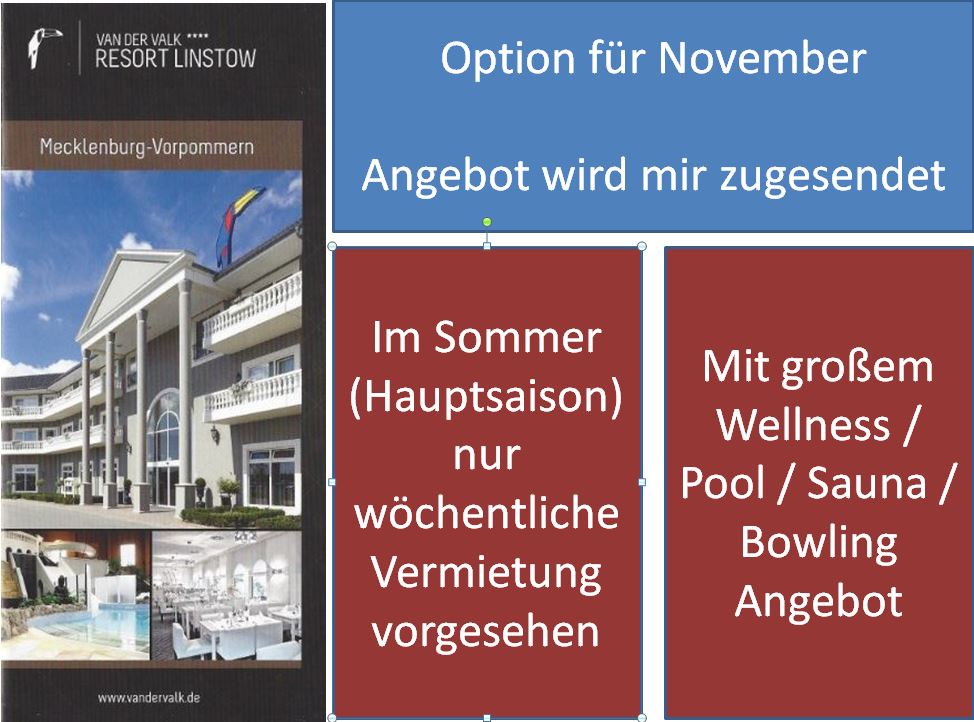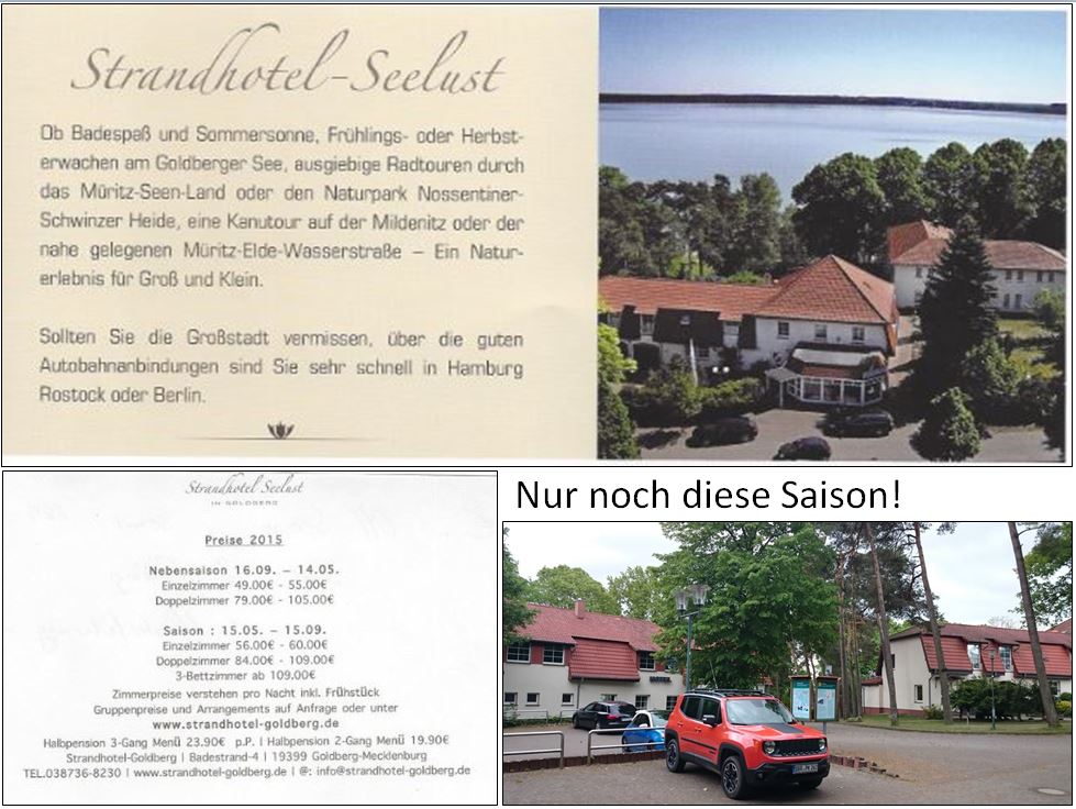 5. Sollten wir innerhalb der nächsten zwei Wochen (bis Ende Mai) feststellen, dass sich ein Meeting - z.B. am Wochenende 05.-07. August, denn dieses schien bislang am besten zu passen - im Sommer anbietet, dann wäre das Strandhotel Seelust in Goldberg eine Option. Hier gäbe es auch noch Unterbringungskapazität für die besagten Wochenenden und sogar besondere Angebote mit abendlichem Drei-Gänge Menü und Klosterführung. Da das Hotel zum Oktober hin schließt, da die Betreiber das elterliche Hotel in Plau am See (vielleicht ergibt sich in Plau am See für den Herbst noch eine Möglichkeit) übernehmen wollen, ist dieses Hotel keine Option für den Herbst. Die Sommersaison läuft in dem Hotel in Goldberg aber ohne Einschränkzungen