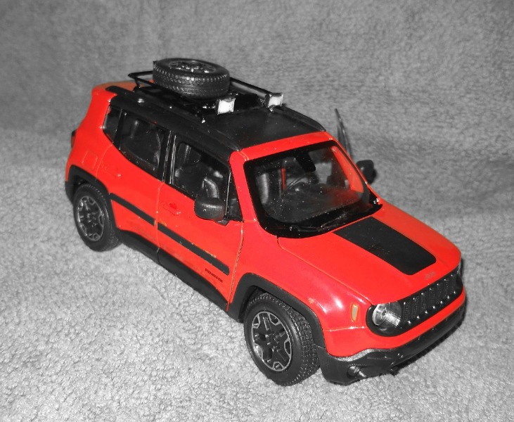 Jetzt habe ich es ein paar Nummern größer gemacht - im Maßstab 1:24. Sicher ist auch hier einiges etwas "improvisiert"... es war gar nicht so einfach, einen halbwegs passenden Dachkorb zu finden und somit brauchte ich ein anderes Modell zum "ausschlachten" (das war ein Trabant! den ich günstig auf dem Flohmarkt schiessen konnte). Ein etwas einfacheres rotes Renegade-Modell musste dann noch ein Rad spendieren und Zusatzscheinwerfer zu basteln war auch eine kleine Herausforderung.