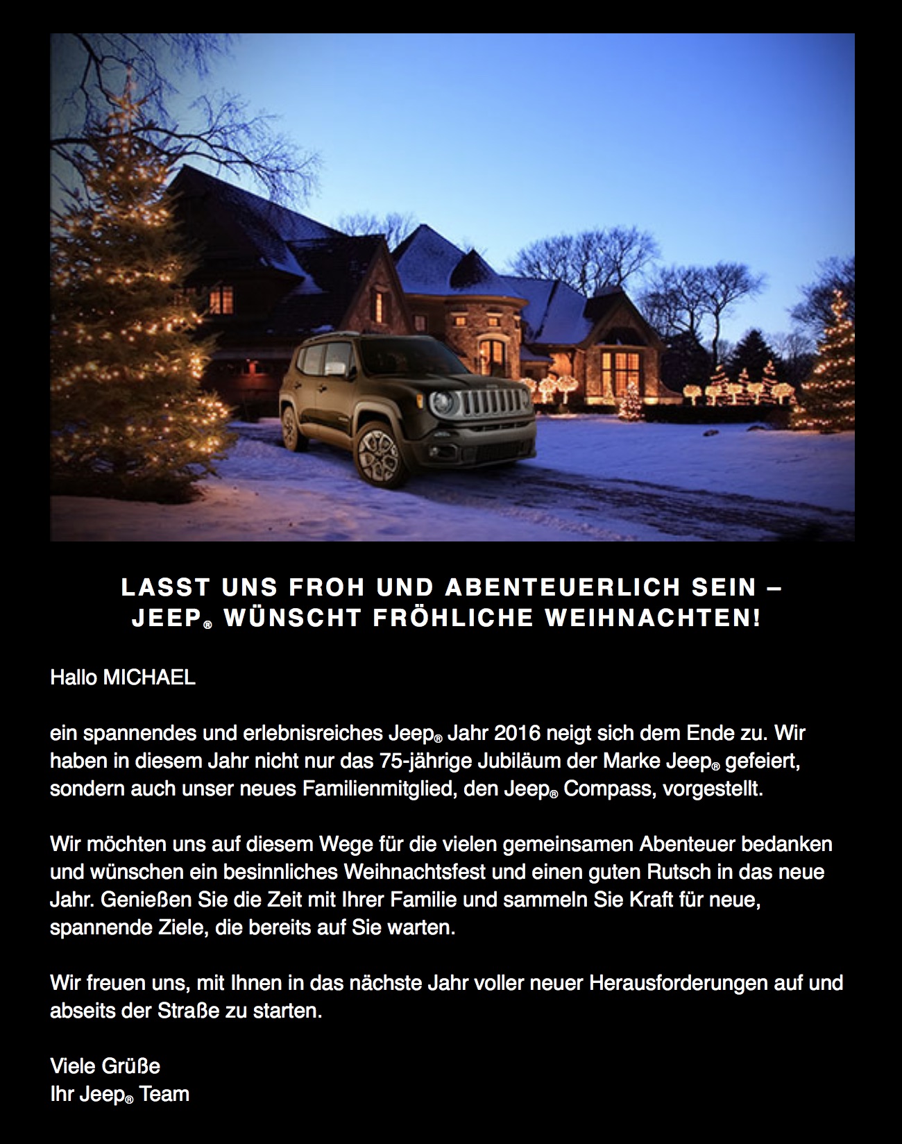 zuerst möchte auch ich allen Mitgliedern, ihren Angehörigen, unseren Forums-Partnern, sowie allen Jeep-Fans ein frohes, gesundes und vor allem friedliches Weihnachtsfest wünschen.