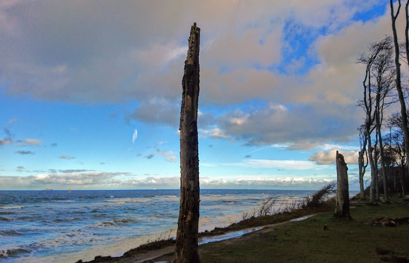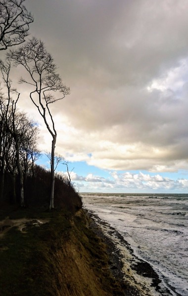 Es ist hier oben an der Ostseeküste ein etwas indifferentes Wetter. Mit 5-7°C etwas kühl, besonders wegen der steifen Nordwest-Brise. Auf meinem Spaziergang an die Steilküste hat es sogar ein wenig gegraupelt. Wenn einem der Graupel waagerecht ins Gesicht bläst, prickelt es ganz schön. Die Sonne bricht aber trotzdem hin und wieder durch die Wolkendecke, und dann ist es eigentlich ganz angenehm.