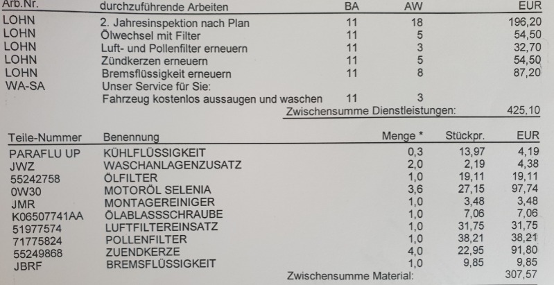 • Was mir sofort an der Rechnung auffällt, der berechnet 1,8 Stunden für den Kndendienst, die eigentlichen Kundendienst-Arbeiten (Ölwechsel, Luftfilter, Pollenfilter, Kerzen ersetzen) dann aber nochmals separat dazu. So etwas habe ich noch nocht gesehn, das würde ich anzweifeln. Bremsflüssigkeit Wechsel ist ok, aber er Rest ist Bestandteil des Kundendienstes. So hat er die Arbeitszeit quasi doppelt berechnet, da kommt der Preis zustande. Die Preise für die Teile sind ok.