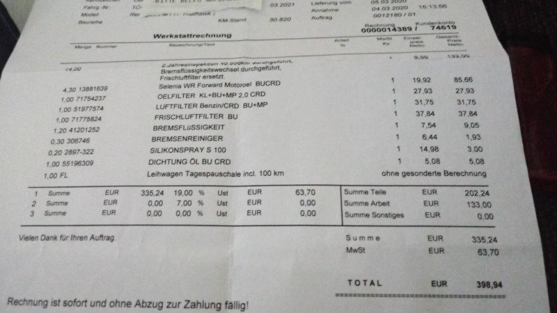 • Ich hab meinen Renegade ja privat verkauft und aber noch die zweite Inspektion beim Händler gemacht bei dem ich den Cherokee gekauft habe, er hat mir noch schnell einen Termin gemacht. heute kam die Rechnung für die Renegade Inspektion: