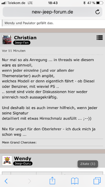 .. sonst sind viele der Diskussionen hier weder sinnreich noch aussagekräftig.Und deshalb ist es auch immer hilfreich, wenn jeder seine Signatur