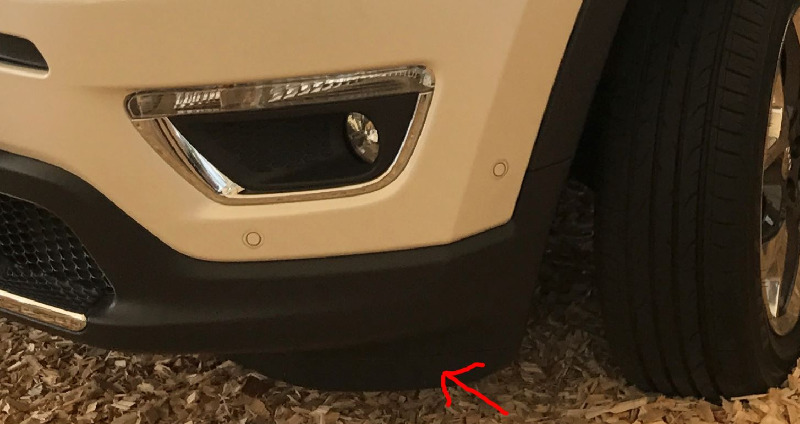 Wo viel Licht ist, ist auch Schatten. Leider wirft der Compass auch einen großen Schatten: Da muss ein Konstrukteur wirklich einen Blackout gehabt haben, anders ist es nicht zu erklären, wie man auf die Idee kommt, unter die vordere Stoßstange eines SUV´s eine senkrechte Wand zu schrauben, die die überfahrbare Schwellenhöhe auf das Nieveau eines Opel Astra reduziert. Hier sind Schäden beim Parken am Bordstein vorprogrammiert. Es sieht aber so aus, als ob dieses völlig deplatzierte Teil nur gesteckt und mit ein paar Schräubchen gesichert ist. Ich würde jedem raten, das Teil noch vor der Übernahme vom Händler entfernen zu lassen.