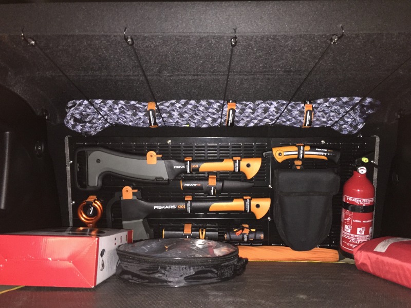 Bergeseil, Spaten, Axt, Machete, Säge, Messer, Schleifstein, Feuerstein, 8er Haken, Dino-Powerbank und Feuerlöscher ![]()