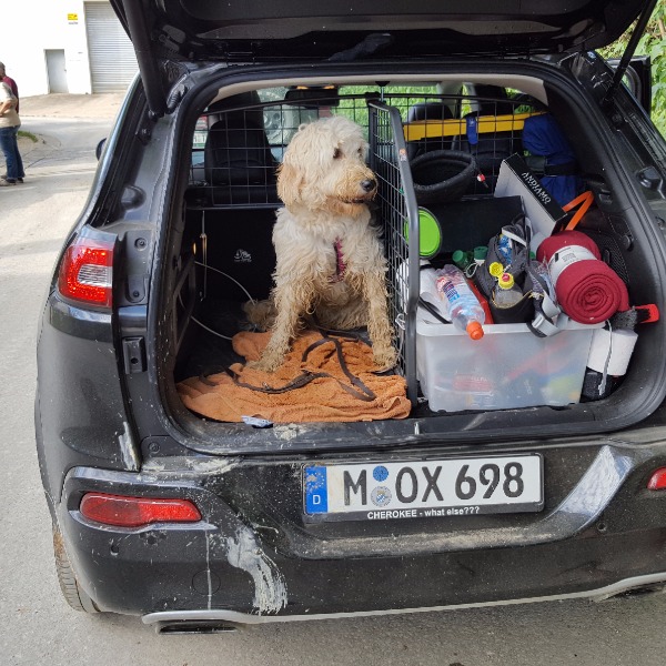 Travall-Devider: Links: ein mal dreckiger Hund - Rechts: Wagenheber, Unterstellböcke, Nusskasten, Klappspaten, Gummistiefel, Drehmomentschlüssel, Bergegurt mit Schäkel, Dino, Abschleppöse, Kompressor, griffbereite Anhängekupplung, Decke, Hundezeugs und noch vieles mehr.