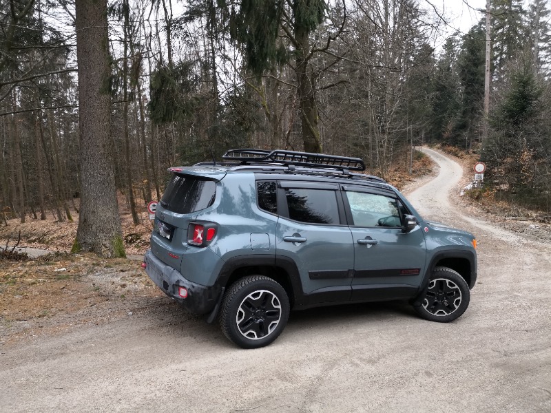 Jeep Renegade Trailhawk 2,0 D mit 170 PS und 9 Gangstufen Automatik, Omaha Orange, ROLA Dachkorb Sandbleche + Bergegeschirr nach Lage. Trekfinder Federn (plus 3cm), Spurplatten 5mm, AT-Reifen 225/65 R 17, Zusatzscheinwerfer vorne / hinten am Dachkorb, Reserverad "on top".