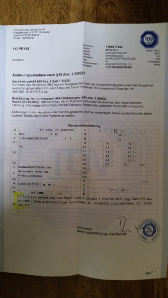 Allerdings ist die Eintragung in Kombination mit meinen H&R Spurplatten (vorne 40mm, hinten 60mm auf der Achse). Wenn Dich das nicht stört .... :D