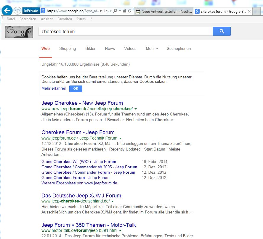 Unter dem Suchbegriff "Cherokee Forum" sind wir nun bei Google erstmalig an allen anderen Foren vorbeigezogen und werden an Nr. 1 gelistet. Aus diesem Grund mal ein herzliches Dankeschön an alle, die sich hier aktiv beteiligen.
