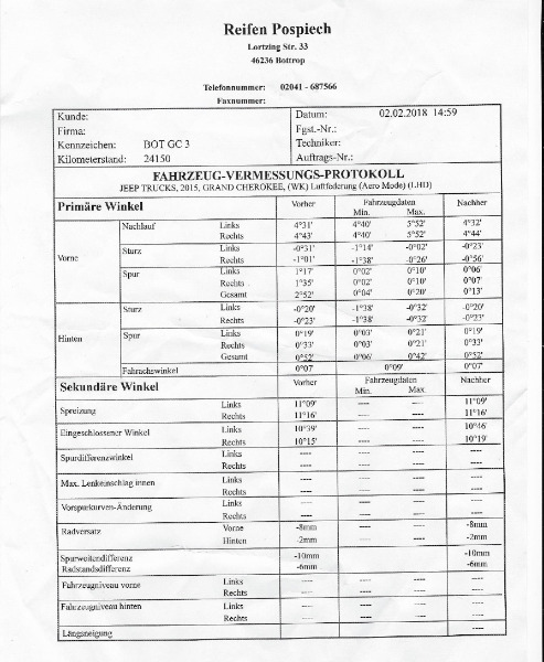 Der Werkstattleiter wo ich es hab machen lassen (meine Jeepwerkstatt hat leider keine Laserbühne, deswegen war ich dort wo die immer hingehen wenn vermessen werden muss ;) ) sagte mir damals was sich wohl mit deinem Ergebnis deckt.