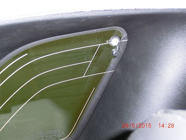 Hinteres rechtes Fenster, hat ähnlich Heizdrähten eingelassene Drähte, die über einen Kabel (Stecker ?) in den Fensterholm gehen. Dieser "Stecker ?" hängt jetzt lose am Kabel daneben !