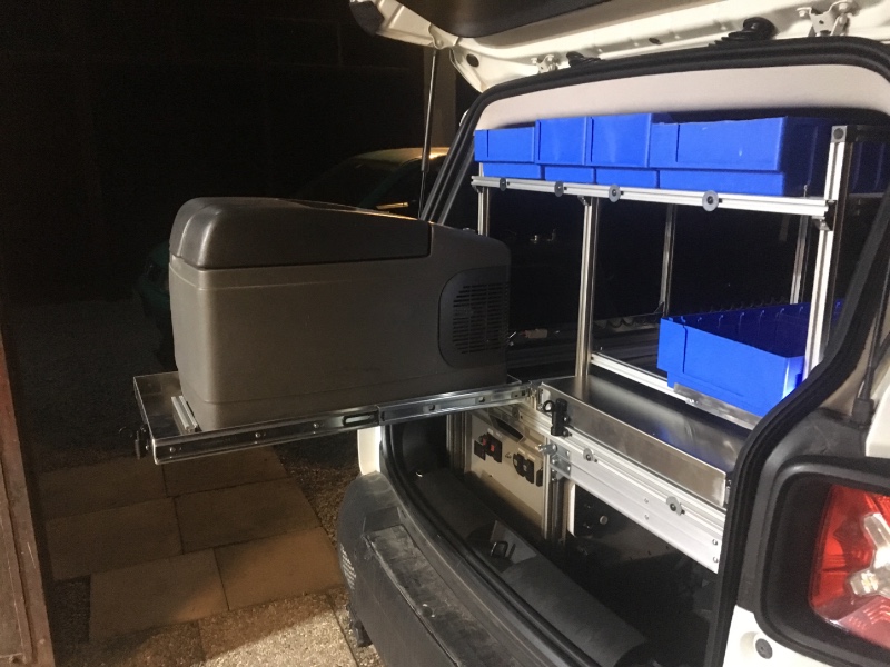 Mann kann einfach alles so machen wie mann will. Es sind zwei teile der untere Teil beinhaltet die Batteriebox und den Klapptisch. Der obere teil ist für den Kühlschrank und Arbeitsfläche mit Stauraum auch die Wasserbehälter haben platz.