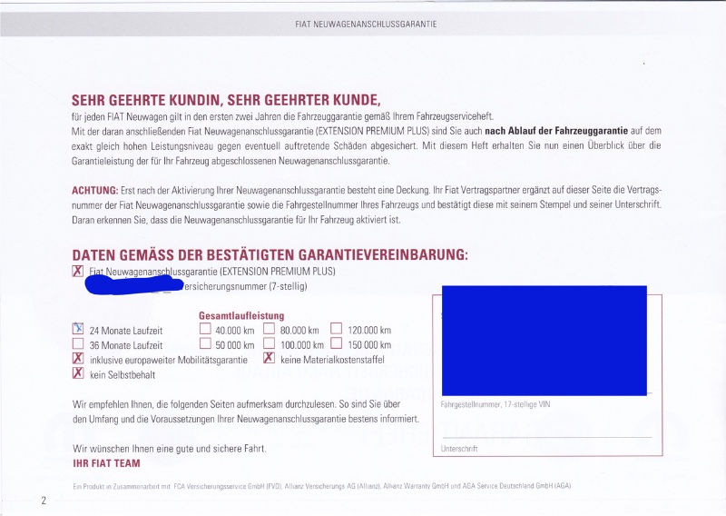 Also musst Du nur ins Serviceheft schauen, in dem die Garantieleistungen der Fahrzeuggarantie der ersten beiden Jahre beschrieben sind. Sicherlich wäre es zwar schön, wenn man auch den kompletten Satz des Allianz-Kleingedruckten beim Kauf gleich ausgehändigt bekäme und nicht noch erst danach fragen muss.