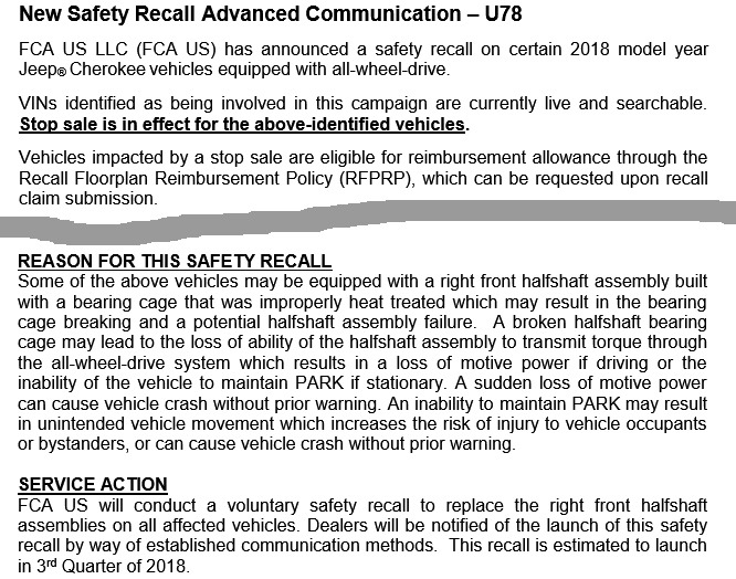 - U78 - Kugellager rechte Achswelle kann brechen, Verkaufsstop, kein Produktionszeitraum genannt, über die VIN-Suche sollen sich die Fahrzeuge aber identifizieren lassen.