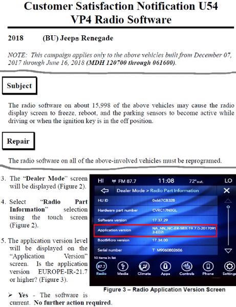 U54 betrifft offensichtlich doch auch europäische Modelle. Konkret die VP4 (das müssten die mit dem 6,5" Bildschirm sein), welches im oben genannten Zeitraum verbaut wurde. Hier kann als Fehler auch ein Problem mit den Parksensoren auftreten, welche sich dann während der Fahrt oder bei ausgeschalteter Zündung aktivieren können.