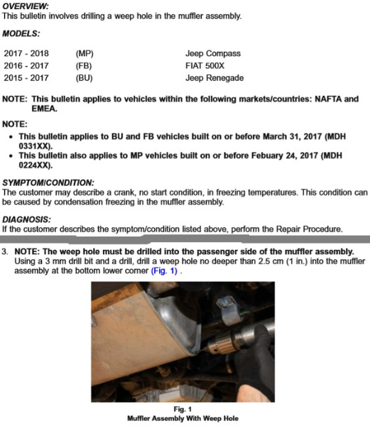 Bei Renegade Modellen, die bis einschließlich 31.03.2017 (und Compass Modellen bis einschl. 24.02.2017 - keine Ahnung, ob davon schon welche für den Export dabei waren) gebaut wurden, kann das Abflussloch im Schalldämpfer fehlen. Das kann bei Frost zu Startproblemen führen. Als Lösung wird das Loch nachträglich reingebohrt (3mm, max. 25 mm tief, auf der Beifahrerseite).