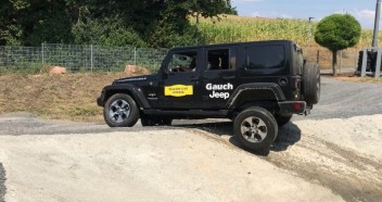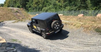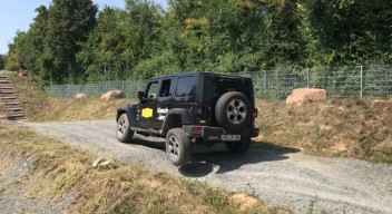 Als erstes musste ich mich richtig ins Auto setzen. Auf die richtige Sitzhaltung musste ich mich erst gewöhnen, ich sass sehr gerade mit angewinkelten Armen am Steuer. Nachher wusste ich warum es so wichtig ist. Als erstes ging es auf normale Feldwege, die man definitiv auch mit meinem Renny hätte fahren können, aber so gewöhnte ich mich an das Auto und an den Hinterradantrieb. Ich bekam sehr ausführlich erklärt, wann man den 4H einstellt und wann er wieder auf 2H zurück muss. An einem Hügel stellten wir die Bergabfahrhilfe ein, besser gesagt Hr. Müller stellte ein und um und mir wurde ein wenig schwindelig bei so vielen neuen Funktionen. Der Wrangler fuhr bzw. tuckerte gemütlich den Berg hinab, ohne dass ich bremsen musste. Unheimlich.