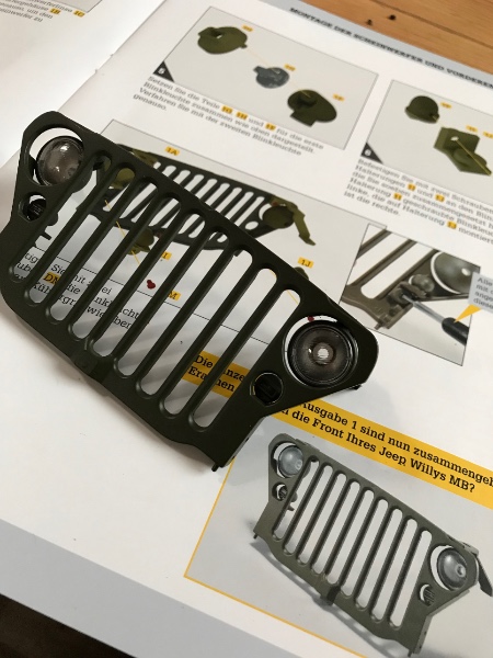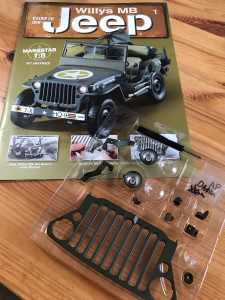 Nach Abschluss des Abos dauert es etwa 10-14 Tage, bis man das erste Modell bekommt, deshalb habe ich gestern beim Zeitungshändler zugeschlagen und mir zwei Ausgaben des ersten Heftes für je 1,99 gekauft. Eins der Hefte werde ich originalverpackt aufheben, mit dem anderen habe ich gestern angefangen. Ich rege an, dass sich ein Jeep-Fan auch nur diese erste Ausgabe kauft, man erhält immerhin einen schonen 1:8 Sevenslot-Grill mit Scheinwerfern, das ganze aus lackiertem Gussmetall.