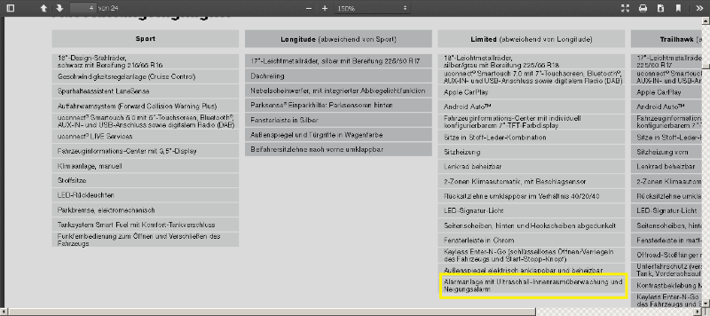 Der Alarm ist schon mal da, das stimmt. Fragen gibt es immer, ob die Innenraumüberwachung mit Ultraschall da ist. Ich sage auch nein. Das steht bei jedem Jeep Modell drin, aber gesehen hat es noch niemand. Überwacht werden wohl nur Türen und Motorhaube.