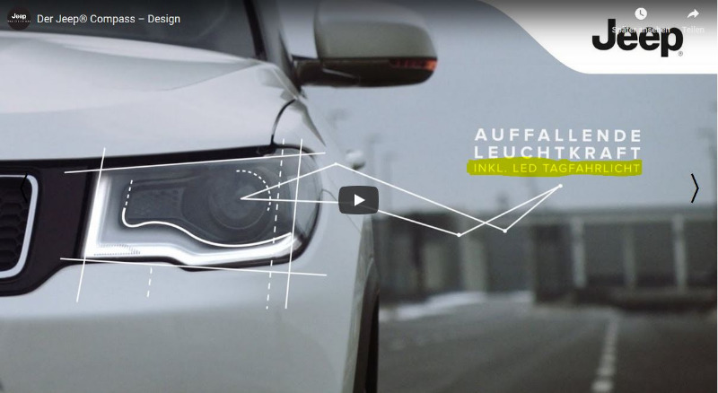 Der LED-Streifen ist schon da, wird aber nicht als Tagfahrlicht genutzt, dafür gibt es noch extra Halogen-Funzeln. Weiß der Geier, warum das so ist. Mit dem LED-Streifen machen sie nur nachts ein bisschen Show, das nennen sie bei Jeep dann LED-Signatur. Auf der Jeep-Homepage wird es aber immer noch als LED-Tagfahrlicht angepriesen.