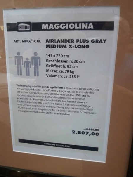 Preislich liegt man hier bei 4255 € und einer Lieferzeit von (aktuell) Mitte bis Ende Oktober. Positiv ist hier zu erwähnen das man das Zelt bzw. die komplette Kombi auch finanzieren kann. Vielleicht ist das Interessant für Mac-OOO?! --->