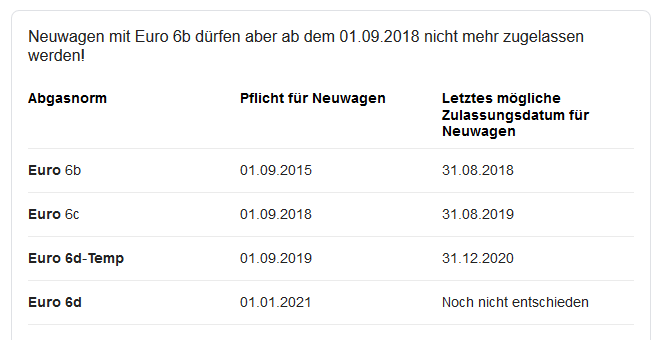 • Doch doch, es geht schon noch schräger: Seit dem 1. September ist die Euro 6d-temp-EVAP-ISC verbindlich. In wie weit da aber Bestandsfahrzeuge mit einbezogen werden, hab ich noch nicht recherchiert, weil mir der Unfug echt langsam zu blöd wird.