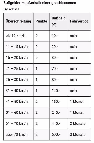 Kann sein das sich das geändert hat, ich hab noch 21 Km/h innerorts und 31 Km/h außerorts für 1 Monat zu Fuß im Kopf (Punkte und Bußgeld sind da ja obligatorisch immer dabei).