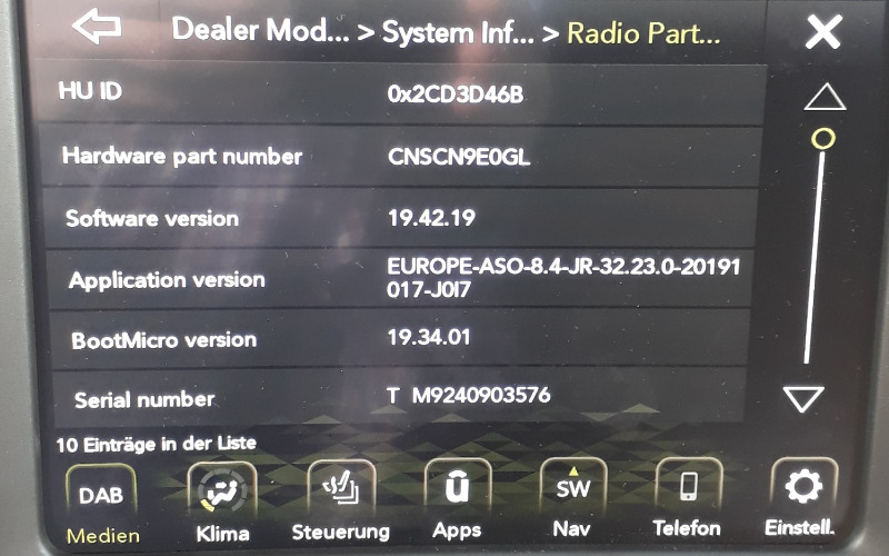 Zur Info hab ich hier noch Fotos aus dem Dealer Menü des betreffenden MY20 Rennegade UConnect beigefügt auf welchen man Hardware/Soiftware-Version und Navi-Datenbasis sehen kann. Man kann dann ja beim eigenen Händler mal vergleichen ;)