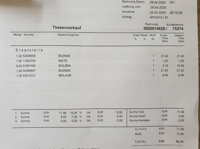 Habe für diejenigen, die Interesse an den Kosten und auch anden Teilenummern haben, mal die Rechnung eingestellt, da sind alle nötigenInformationen drauf.