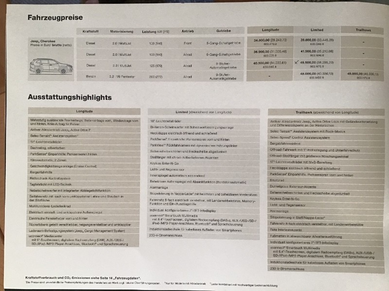 Seit letztem Jahr fahre ich einen Cherokee Trailhawk, den ich gebraucht kaufte. Da ich ihn auch für Firmenthemen verwende, bräuchte ich für die Buchhaltung den Bruttolistenpreis. Kann mir da jemand helfen? Das wäre sehr nett.