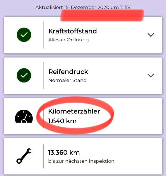Wenn ich dieser Anzeige in der App glauben soll, läuft der Km-Zähler sogar rückwärts. (S. Fotos)