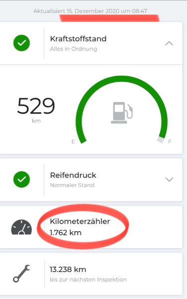Wenn ich dieser Anzeige in der App glauben soll, läuft der Km-Zähler sogar rückwärts. (S. Fotos)