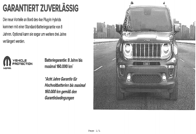 Für kurze Zeit stand auf der Home Page von Jeep unter den Garantie Bedingungen für die Hochvoltbatterie . Optional kann die Garantie sogar um weitere drei Jahre verlängert werden. Dieser Zusatz wurde wieder entfernt.