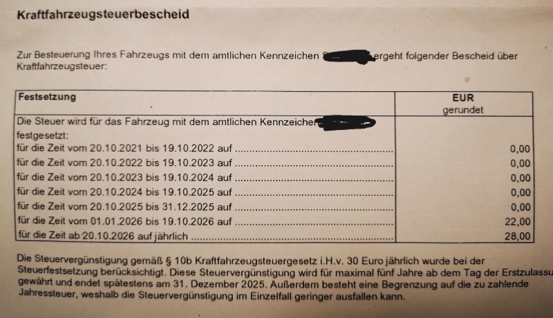 Anbei noch ein Foto des Steuerbescheides. Habe das Auto mit 6 Monaten übernommen, daher die ungerade Laufzeit der 5 Jahre.