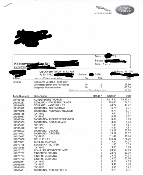 • Hallo, meinem Schwager ist auf der Autobahn der Diesel Motor seines Land Rover Discovery Sport verendet. Er wurde vom ADAC in den nächsten Land Rover shop abgeschleppt. Kostenvoranschlag 15.000 Euro.