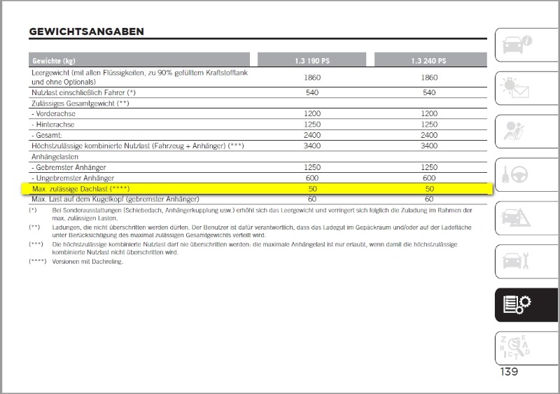 Die Dachlast ist bei Jeep so eine lustige Zahl ... mein Renegade hat 15kg weniger, weil er AddBlue drin hat, ohne hätte er 65kg statt 50kg, bei gleichem Motor!