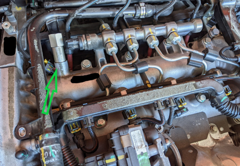 Nun geht es oben am Zylinderdeckel weiter: Stecker des Dieseldrucksensors vom Commonrail abziehen und die Öldampfleitung abschrauben. Die Leitung kann an den Schläuchen bleiben. Diese sind flexibel genug, damit man die Öldampfleitung etwas beiseiteschieben kann, um Platz zu bekommen. Die Schraube für die Nockenwellenarretierung abschrauben (siehe Bild) und die Nockenwellenarretierung dort rein drehen.