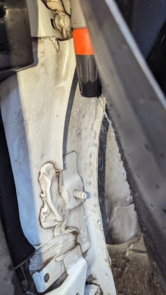 Anfangs hatte ich nach Deiner Beschreibung auch irgendwie den Radkasten im Fokus, aber konnte mir nicht vorstellen von wo, zur Hölle, da Wasser reinlaufen kann. (ausser vlt vom Rad selbst). Nun ist es also echt so, dass das Wasser "von oben" kommt. Was mir nicht klar ist, ..wie kommt denn das "tagwasser" da in diese verzwickte Ecke?