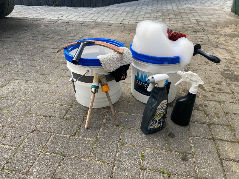 der rechte Eimer ist der Eimer mit dem sauberen Wasser, aus welchem wir mit dem Waschhandschuh direkt auf den Lack gehen