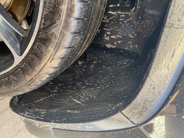 - die Bürste und die Radhäuser gut mit der Mischung aus der Flasche einsprühen und kräftig schrubben. Anschließend alles mit dem Schlauch abspülen und ggf. wiederholen.