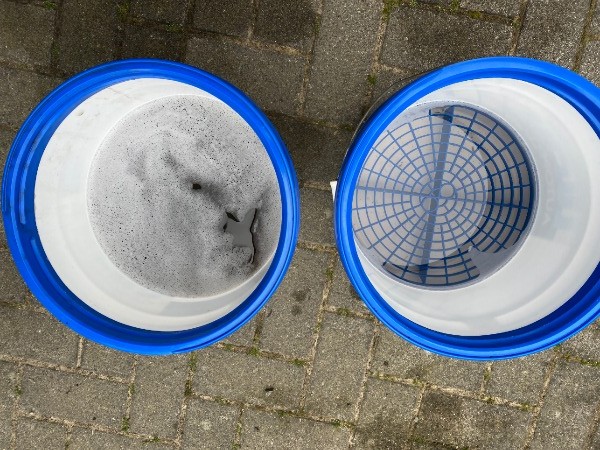 2. die zwei Eimer für die Fahrzeugwäsche vorbereiten. In einen der Eimer kommt ein guter Schuss Autoshampoo. Hier sollte darauf geachtet werden, dass der Eimer sauber ist. Bei dem zu verwendenden Shampoo sollte man richtiges Autoshampoo verwenden. Bitte kein Spülmittel oder Universalreiniger, da diese eine sehr stark entfettende Eigenschaft haben und eine evtl. vorhandene Versiegelung oder einen aufgetragenen Wachs umgehend entfernen.