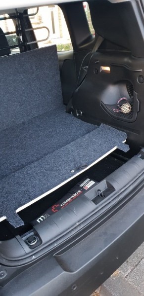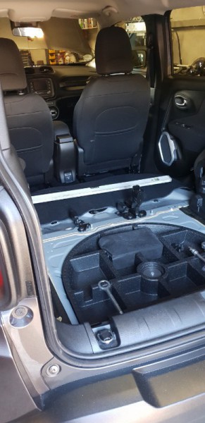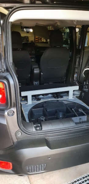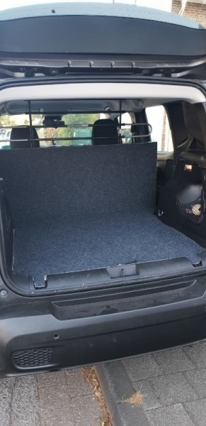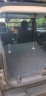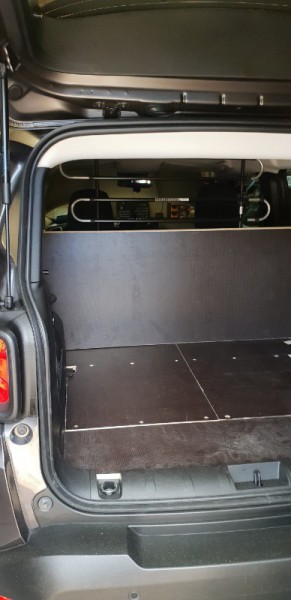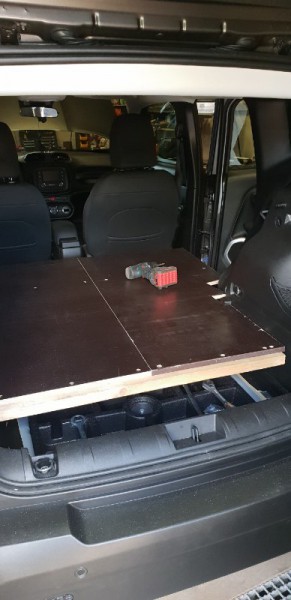 Rückbank und Lehne raus, Bretterboden (mit Bodenstütze) rein. Teppich verlegt.