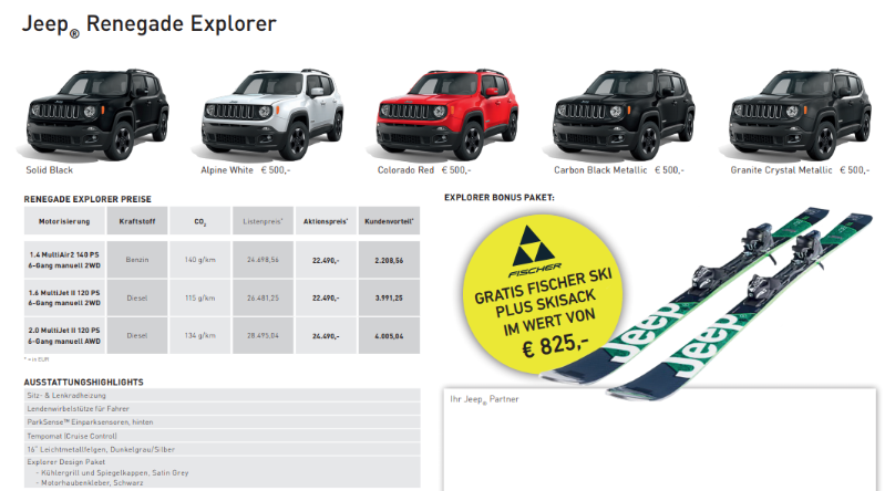 Zitat von KonsumentenschutzIn den mitgesendeten Unterlagen findet sich beim ersten Blatt die Preisangabe „AB“ 22.490 Euro. Am Ende der zweiten Seite findet der Hinweis, dass sich die Gültigkeit auf teilnehmende Händlerpartner beziehen. Für die angeführten Farben (außer „ Solid Black“) sind zudem weitere 500 Euro veranschlagt. Ausgehend von einem aufscheinenden „Aktionspreis“ (Stand Oktober 2017) in Höhe von 22.490 Euro kann der Tabelle ein „Listenpreis“ in Höhe von 24.698,56 Euro für die Motorisierung 1,4 Multi Air 2 entnommen werden. Mit einer alternativen Farbe ergibt sich ein Listenpreis von etwa 25.200 Euro. Selbst dann, wenn die Aussage, dass der genannte Listenpreis (26.000 Euro) belegbar wäre, erscheint fraglich, ob eine diesbezügliche Abweichung im Rahmen einer Irrtumsanfechtung zu einer Preisanpassung führen könnte, zumal es sich bei den Listenpreisen um unverbindliche Herstellerempfehlungen handelt und keine fixierten Preise.
