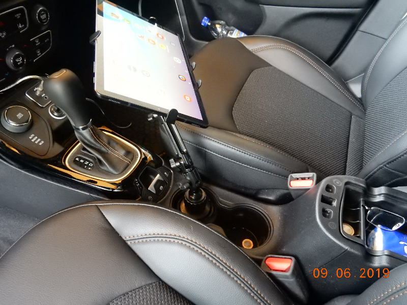 Hier seht Ihr weiter, wie meine Obrigkeit ihr Tablet im Compass positioniert hat. Die Montage im ungenutzten Getränkehalter, Ascher ist entfernt, bot sich direkt an, mich stört es beim Automatikfahren so nicht, der Ehefrieden ist damit gesichert und es gibt Ruhe.