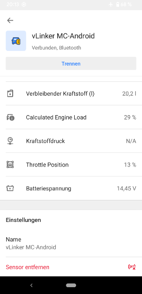 Der vLinker zieht im Leerlauf ca. 19mA Strom bei 12V. Ohne Bluetooth-Verbindung zum Händie wird's ihm dann bald langweilig und er legt sich nach 20 min. schlafen, zu erkennen daran, dass alle LED aus sind. Der Strombedarf im Schlafmodus beträgt so ca. 2,5 mA.