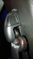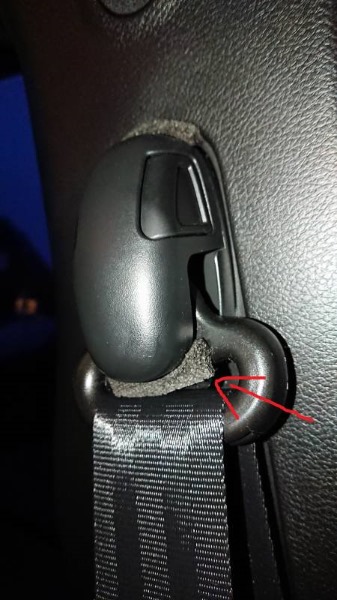 Das Hauptgeräusch war aber das Klappern des oberen Gurtumlenkers in seiner Führung. Ich habe dazu zwei Nitto-Schaumstreifen (so eine Art Moosgummi, selbstklebend) verklebt. Eins oben, als Anschlag zur Verkleidung (das ist aber anscheinend nicht die Quelle) und einen Streifen direkt unter dem Drehgelenk des Umlenkers (sieh roter Pfeil). Der Streifen schränkt die Funktion nicht ein - eliminiert aber komplett das Geräusch. Jetzt ist Ruhe!