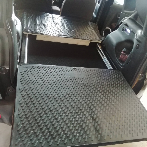 Hab mir auf die Schnelle ein Brett gebastelt, die Schräge ausgeglichen und ne Matte drauf getackert, fertig ist der "Laderaum".